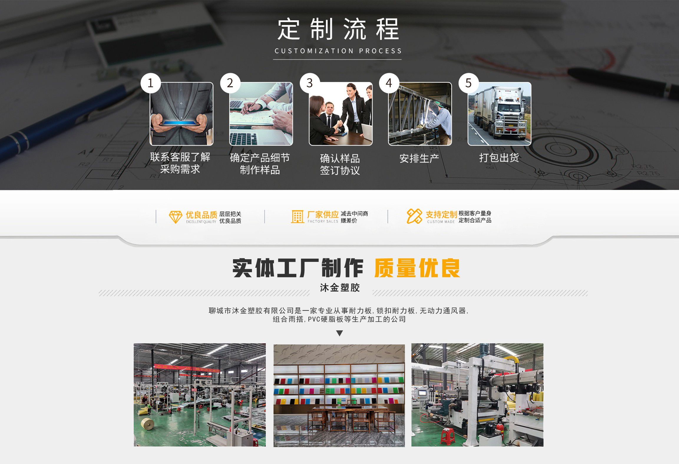 聊城市沐金塑膠有限公司注冊資金2180萬元,占地20000余平方,擁有自建廠房15000平方,員工100余名。10余年來,公司主營耐力板,鎖扣耐力板,耐力板深加工,無動力通風器,組合雨搭,PVC硬脂板,耐力板廠家等板材的發展戰略,逐漸成長為綜合性企業。 公司擁有多條板材共擠生產線,采用世界知名品牌進口原材料和先進工藝,依據完善的ISO9001質量管理體系和ISO14001環境管理體系,為產品的卓越品質提供了強有力的保證。憑借過硬的創新能力和堅實的硬件基礎,贏創已成為國內領先的熱塑性板材生產商,產品被廣泛應用于建筑業、農業、工業、廣告業、安防行業及DIY領域。 公司始終致力于通過提供最優的板材應用解決方案,為客戶創造最高的價值;堅守創新、質量、靈活、服務和速度的核心價值觀;堅持“完美的產品需要完美服務的支持”的經營理念,努力實現成為世界領先的板材與解決方案供應商的夢想。 在未來,公司將立足客戶需求,不斷改變和完善現有產品,拓展產品線和充分開發板材的應用領域,為客戶創造全方位的價值。同時更好地實現員工的價值,實現公司團隊的價值。我們將與您一起創贏未來! 企業使命:成為世界領先的板材與解決方案供應商?! 」驹妇埃和ㄟ^提供最優的板材應用解決方案,為客戶創造最高的價值。 核心價值觀:質量...